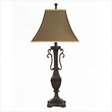 12345 Features: -Table lamp. -Resin construction. -Black leather looking post iron handles on the sides. -Gold with yellow trim brown silk shade. -Three switches: High, medium and low. -For indoor use only. -Light assembly required. Specifications: -Shade dimensions: 11'' H x 15.5'' W x 15.5'' D. -Overall dimensions: 33'' H x 6'' W x 6'' D. Manufactured to the Highest Quality Available. Design is stylish and innovative. Satisfaction Ensured. Great Gift Idea.
