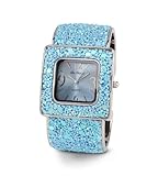 Create a fun and stylish look when you put on this bangle watch. The glittered coated band is accented with a silver tone metal that brings out the sparkles on this functional time piece. The square face of the watch is easy to read, allowing you to easily keep track of time. An easy way to dress up any outfit.