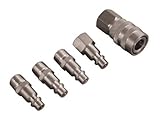 MIT 5-PC. ZINC QUICK COUPLER SET features: Precision Machined for Leak-Proof Operation, Quickly Locks Tools onto Air Hoses, Coupler Assures Easy Connects and Disconnects, Fittings Rotate to Eliminate Twisted Hoses, Universal Fit for 1/4" NPT Tools, 1-pc. Female Quick Coupler, 1-pc. Female Connector, 3-pc. Male Connectors Rugged zinc-plated steel construction Precision machined for leak-proof operation Allows one-touch connecting and disconnecting of tools and accessories Fitting rotate to eliminate twisted hoses Universal fit for 1/4-Inch NPT tools