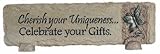 Real chisseled quarry stone elements are used in the casting process to create strong detail plus realistic look and feel. Relevant, metal accent motifs support the message and add to the value. Reads: Cherish your Uniqueness...Celebrate your Gifts. Size: 7" DIAMETER, 7 5/8" H